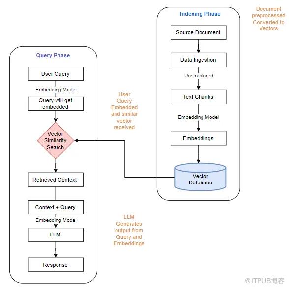 在查询阶段,将用户查询通过嵌入模型转换为嵌入,并从向量数据库中检索类似的内容,LLM根据问题和检索内容生成答案。