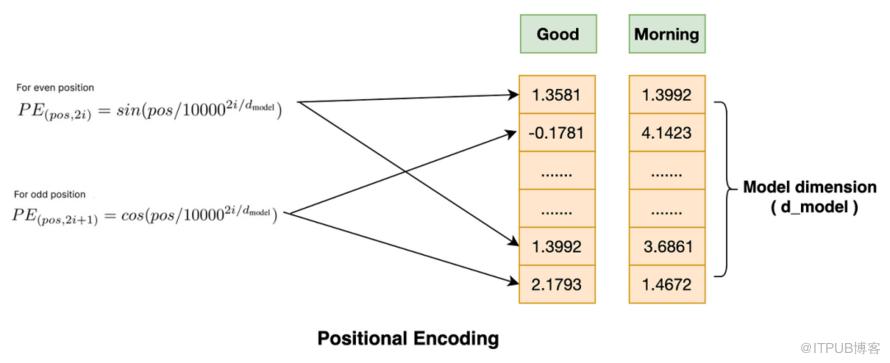 Sin 函数应用于每个偶数维值,而cosine函数应用于嵌入向量的奇数维值。最后,将生成的位置编码器矢量添加到嵌入向量中。现在,我们有了嵌入向量,它可以捕获token的语义含义以及token的位置。请注意,位置编码的值在每个序列中都保持不变。