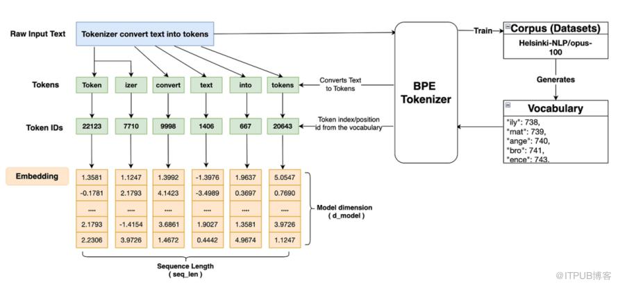 Transformer模型不能直接处理原始文本,它只处理数字。因此,我们必须做一些事情来将原始文本转换为数字。为此,我们将使用一种流行的分词器,称为 BPE 分词器,它是在 GPT3 等模型中使用的subword分词器。我们将首先在语料库数据(在本例中为训练数据集)上训练 BPE 分词器,我们在步骤 1 中准备了该数据。流程如下图所示: