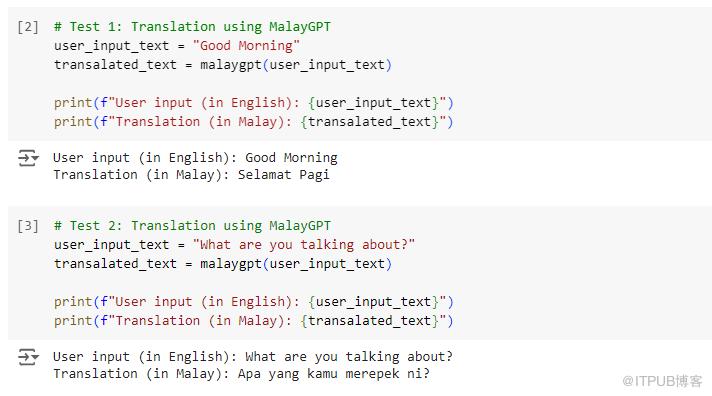 我们将为我们的翻译函数提供一个新的通用名称,称为 malaygpt。这接受用户输入的英语原始文本,并输出马来语的翻译文本。让我们运行该函数并尝试一下。