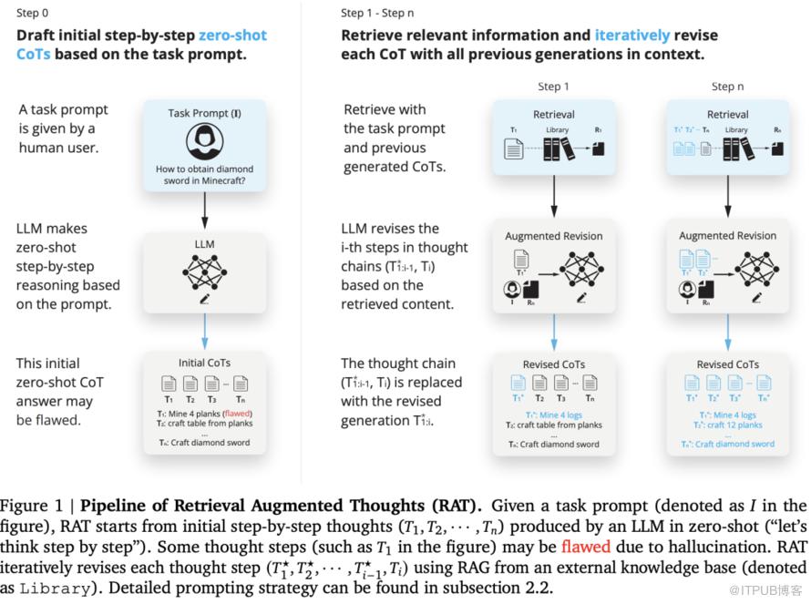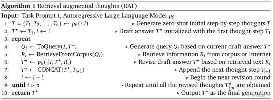 使用RAG修正CoT产生的每一个思维步骤提示,算法如图1和算法1所示。具体来说,给定任务提示I、 我们首先让LLM以zero-shot(“let’s think step-by-step”)逐步生成思考