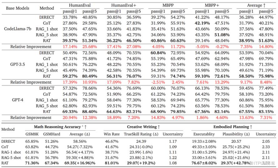 论文在一系列具有挑战性的长期任务中评估RAT,包括代码生成、数学推理、具体任务规划和创造性写作,使用了几种不同规模的LLM:GPT-3.5、GPT-4、CodeLLaMA-7b。结果表明:与vanilla CoT提示和RAG方法相比,将RAT与这些LLM相结合具有强大的优势,在如下任务中达到SOTA性能水平: