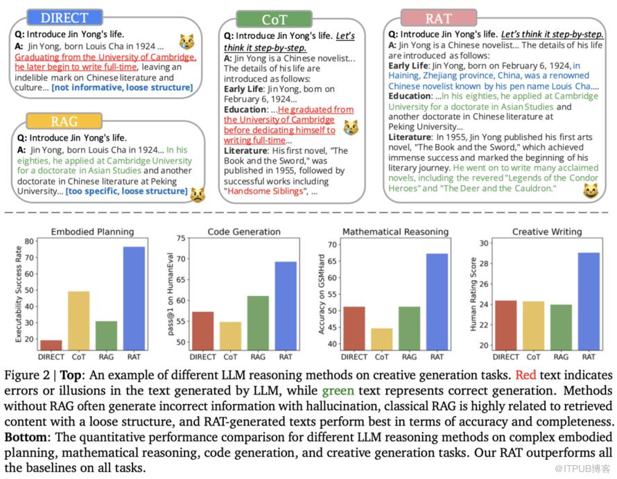 北京大学、加州大学洛杉矶分校和北京通用人工智能研究院的研究人员探索如何在信息检索的帮助下迭代修改思想链提高大型语言模型在长生成任务中的推理和生成能力,同时极大地减轻幻觉。特别是,所提出的方法——检索增强的思想(RAT):利用检索到的与任务查询相关的信息逐一修正每个思考步骤,在生成初始零样本CoT之后,将RAT应用于GPT-3.5、GPT-4和CodeLLaMA-7b大大提高了它们在各种长期范围内的性能生成任务;平均而言,代码生成的评分相对提高了13.63%,16.96%在数学推理方面,19.2%的人在创造性写作方面,42.78%的人在具体任务计划方面。