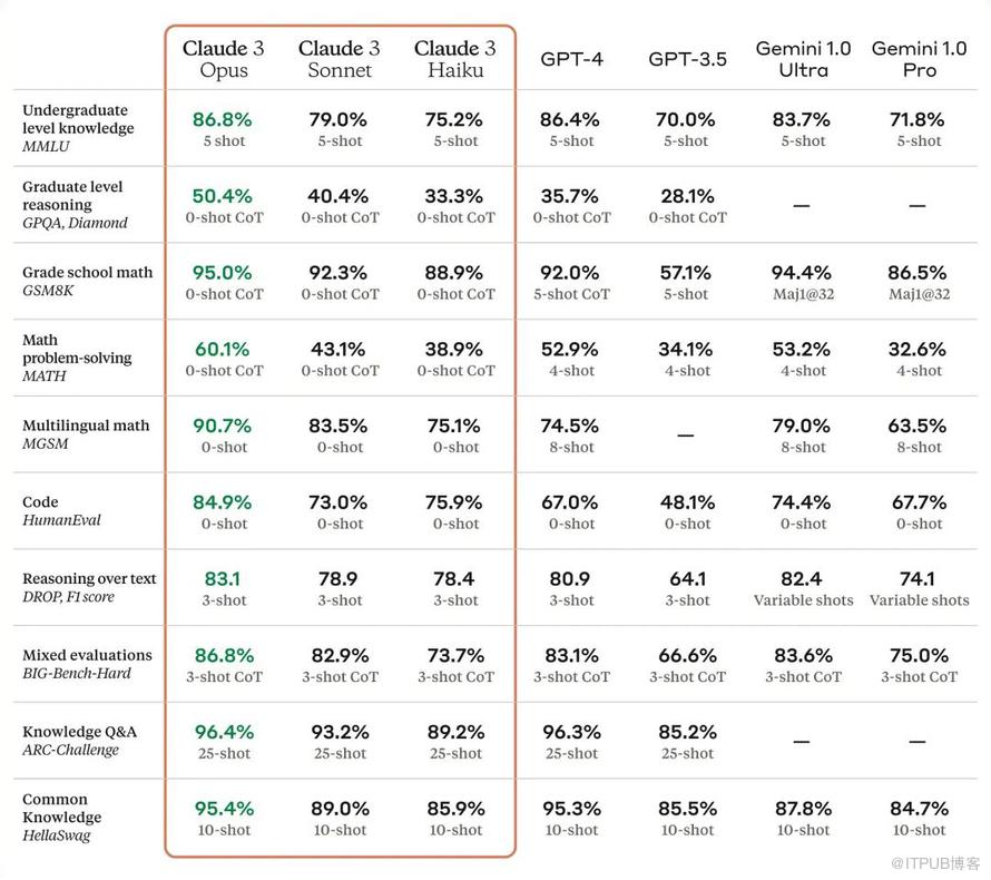 Opus在研究生水平专家推理、基础数学、本科水平专家知识、代码等10个维度,超过OpenAI的GPT-4。