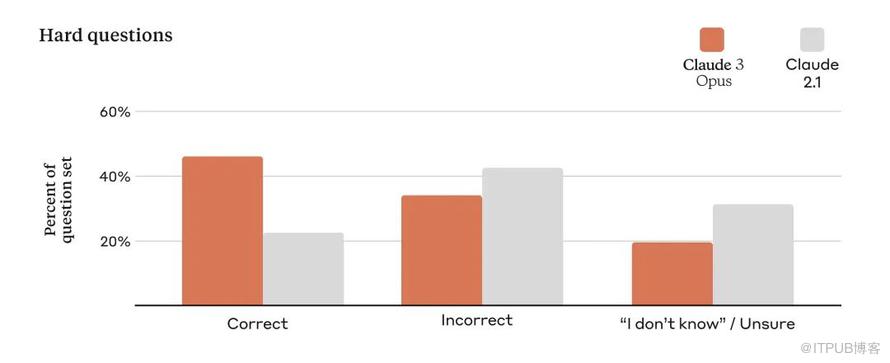各种规模的企业都依赖我们的模型为客户服务,因此我们的模型输出必须在规模上保持高精度。为了评估这一点,我们使用了一大组复杂的事实问题,这些问题针对当前模型中的已知弱点。我们将反应分为正确答案、错误答案(或幻觉)和承认不确定性,其中模型说它不知道答案,而不是提供不正确的信息。与Claude 2.1相比,Opus在这些具有挑战性的开放式问题上的准确性(或正确答案)提高了两倍,同时错误答案的水平也有所降低。