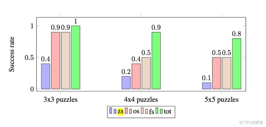 上图显示了四种方法的成功率:zero-shot(zs)、one-shot(os)、few-shot(fs)和Tree-of-Thought(tot)。