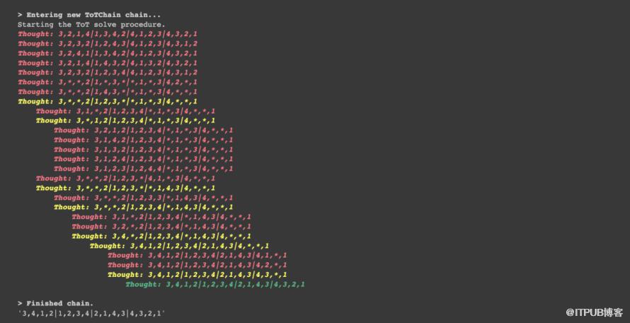 pip install langchainpip install langchain_experimentalpip install -U langsmithpip install openai#######import osfrom uuid import uuid4unique_id = uuid4().hex[0:8]os.environ["LANGCHAIN_TRACING_V2"] = "true"os.environ["LANGCHAIN_PROJECT"] = f"Agent Tot"os.environ["LANGCHAIN_ENDPOINT"] = "https://api.smith.langchain.com"os.environ["LANGCHAIN_API_KEY"] = "xxxxxxxxxxxxxxxxxxxxxxxx"os.environ['OPENAI_API_KEY'] = str("xxxxxxxxxxxxxxxxxxxxxxxx")#######from langchain.llms import OpenAIllm = OpenAI(temperature=1, max_tokens=512, model="text-davinci-003")#######sudoku_puzzle = "3,*,*,2|1,*,3,*|*,1,*,3|4,*,*,1"sudoku_solution = "3,4,1,2|1,2,3,4|2,1,4,3|4,3,2,1"problem_description = f"""{sudoku_puzzle}- This is a 4x4 Sudoku puzzle.- The * represents a cell to be filled.- The | character separates rows.- At each step, replace one or more * with digits 1-4.- There must be no duplicate digits in any row, column or 2x2 subgrid.- Keep the known digits from previous valid thoughts in place.- Each thought can be a partial or the final solution.""".strip()print(problem_description)######## The following code implement a simple rule based checker for# a specific 4x4 sudoku puzzle.#######from typing import Tuplefrom langchain_experimental.tot.checker import ToTCheckerfrom langchain_experimental.tot.thought import ThoughtValidityimport reclass MyChecker(ToTChecker):def evaluate(self, problem_description: str, thoughts: Tuple[str, ...] = ()) -> ThoughtValidity:last_thought = thoughts[-1]clean_solution = last_thought.replace(" ", "").replace('"', "")regex_solution = clean_solution.replace("*", ".").replace("|", "\\|")if sudoku_solution in clean_solution:return ThoughtValidity.VALID_FINALelif re.search(regex_solution, sudoku_solution):return ThoughtValidity.VALID_INTERMEDIATEelse:return ThoughtValidity.INVALID######## Testing the MyChecker class above:#######checker = MyChecker()assert checker.evaluate("", ("3,*,*,2|1,*,3,*|*,1,*,3|4,*,*,1",)) == ThoughtValidity.VALID_INTERMEDIATEassert checker.evaluate("", ("3,4,1,2|1,2,3,4|2,1,4,3|4,3,2,1",)) == ThoughtValidity.VALID_FINALassert checker.evaluate("", ("3,4,1,2|1,2,3,4|2,1,4,3|4,3,*,1",)) == ThoughtValidity.VALID_INTERMEDIATEassert checker.evaluate("", ("3,4,1,2|1,2,3,4|2,1,4,3|4,*,3,1",)) == ThoughtValidity.INVALID######## Initialize and run the ToT chain,# with maximum number of interactions k set to 30 and# the maximum number child thoughts c set to 8.#######from langchain_experimental.tot.base import ToTChaintot_chain = ToTChain(llm=llm, checker=MyChecker(), k=30, c=5, verbose=True, verbose_llm=False)tot_chain.run(problem_description=problem_description)#######