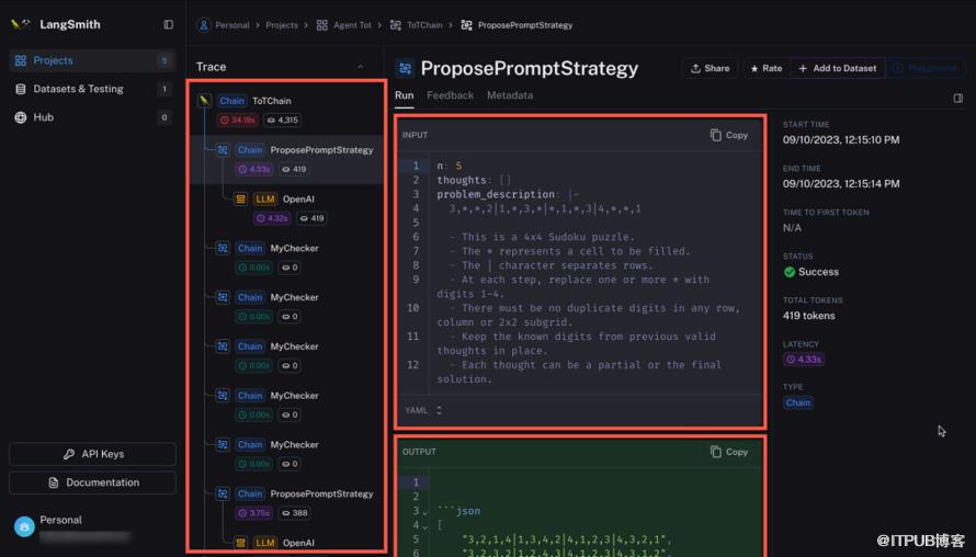 此图显示了Trace部分,其中包含为该代理创建的完整链,以及输入和输出。LangSmith在链的每一步都给出了详细的分解,包括成本(tokens)和延迟。
