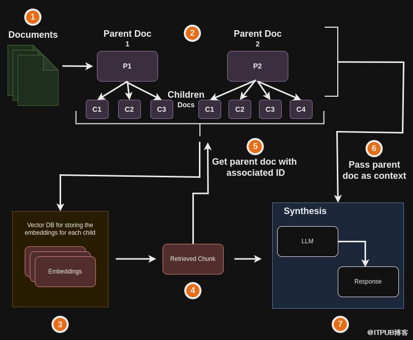 首先检索与查询最相关的较小数据段,然后将相关的较大的父数据块作为上下文传递给LLM(大型语言模型)。在LangChain中,可以使用ParentDocumentRetriever来完成。
