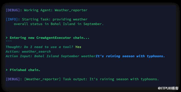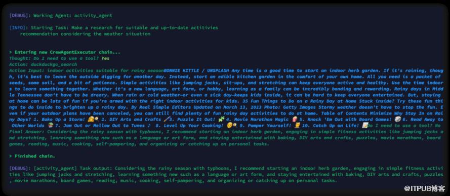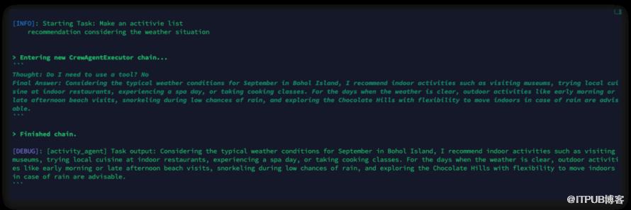 在应用程序重新运行后,根据结果,weather_reporter和activity_agent都将开始使用该工具来支持它们的响应生成(蓝色句子)。