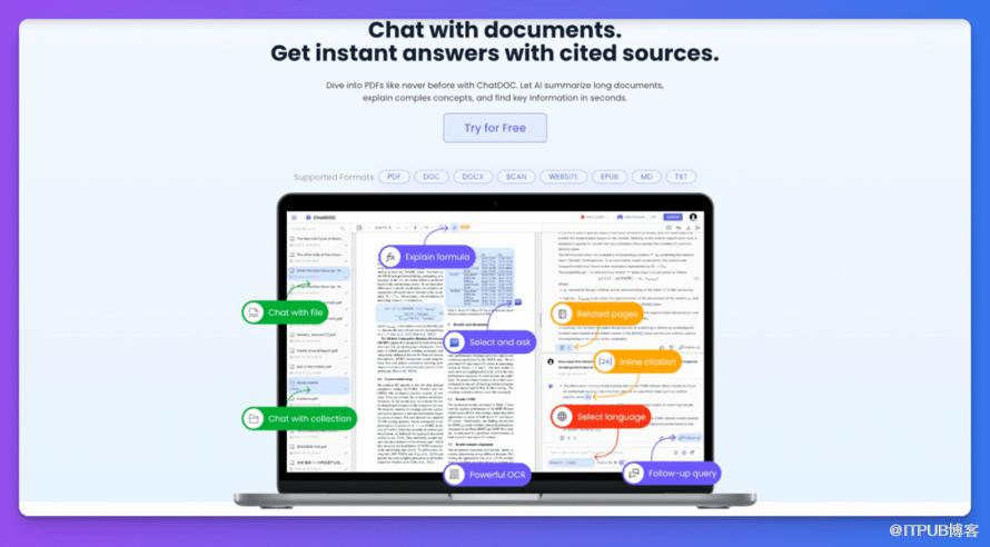ChatDOC现在支持广泛的文件格式,不仅仅是PDF文档,包括:word文件(.doc、.docx)、markdown、epub、txt、扫描文件、网站。图像支撑在规划中。