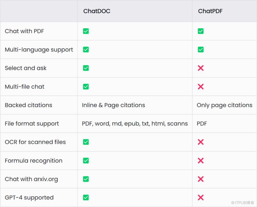 那么,对于知识密集型人群来说,哪一款更强大,也是最好的人工智能阅读助手呢?以下表格清楚地显示了ChatDOC和ChatPDF之间的区别。