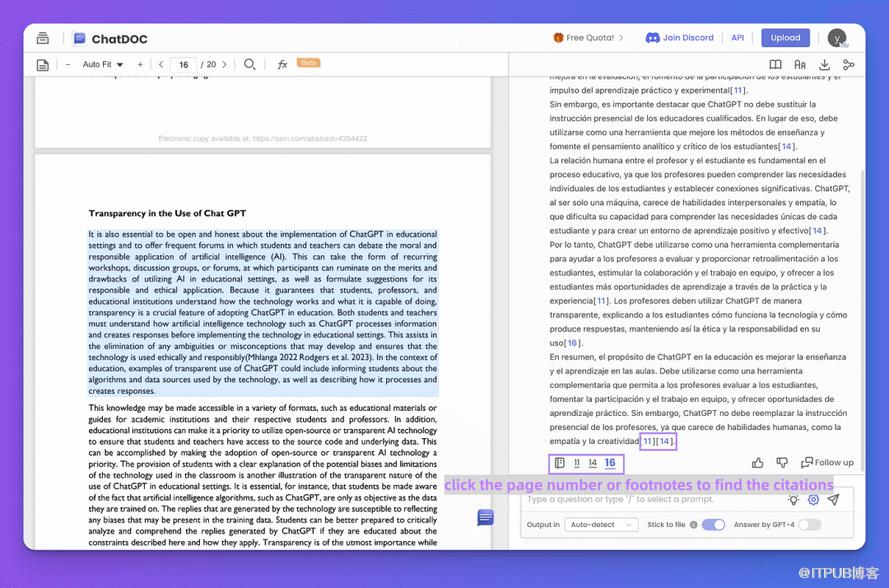 人工智能可能会撒谎,但ChatDOC不会。ChatDOC是一个可靠的人工智能阅读工具,因为它支持每一个答案引用。您可以单击页码或脚注,将答案来源追溯到原始部分。不仅每一个回答,甚至答案的每一个部分都有一个参考,用于事实核查。