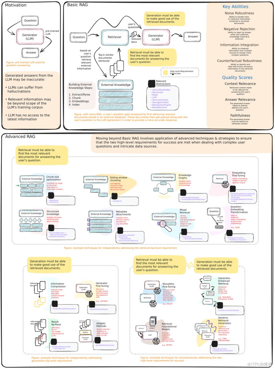 ? 高级RAG:构建高级RAG需要应用更复杂的技术和策略来满足成功要求。这些技术既可以独立地满足其中一个高级成功需求,也可以同时满足这两个需求。