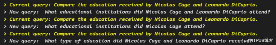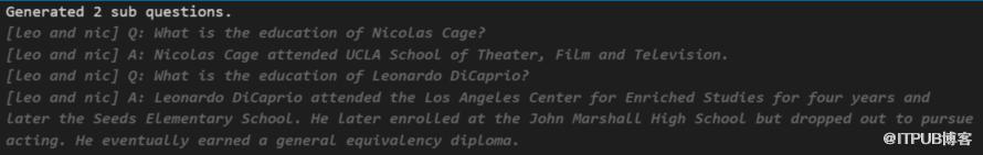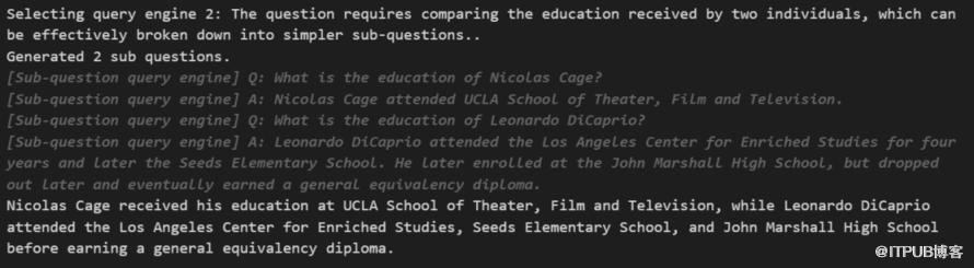 这一次,生成子问题非常有用,因为我们需要比较两条不同的信息——两个不同的人的教育背景,每个子问题都可以使用检索到的上下文独立回答。