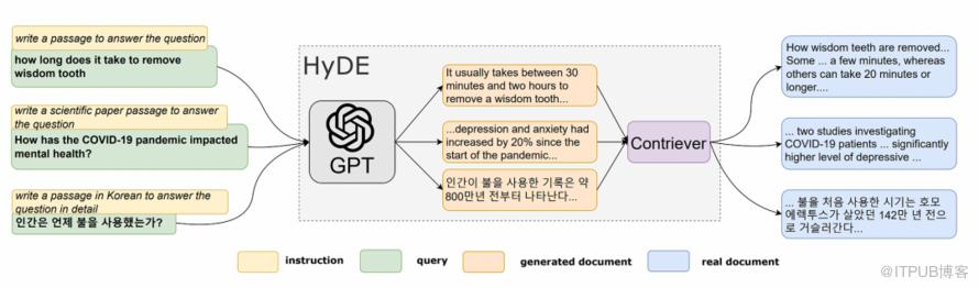 Hypothetical Document Embeddings(HyDE)是一种生成文档嵌入以检索相关文档而不需要实际训练数据的技术。首先,LLM创建一个假设答案来响应查询。虽然这个答案反映了与查询相关的模式,但它包含的信息可能在事实上并不准确。