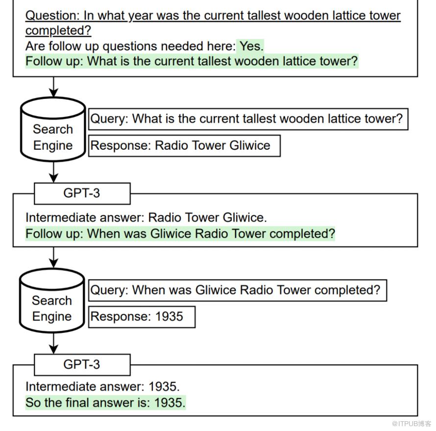 自我询问的方法旨在克服这一限制。在测试时,我们只需向模型提供提示和问题,它就会自动生成必要的后续问题,以连接事实,组成推理步骤,并决定何时停止。