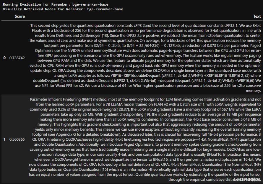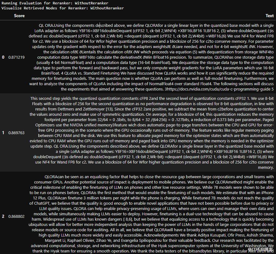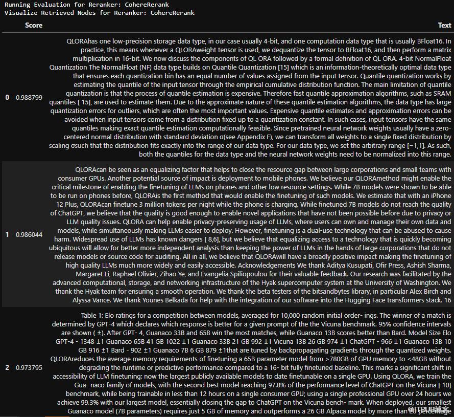 query_str = "What are the top features of QLoRA?"results_df = pd.DataFrame()# Loop over rerankersfor rerank_name, reranker in RERANKERS.items():print(f"Running Evaluation for Reranker: {rerank_name}")query_bundle = QueryBundle(query_str)retrieved_nodes = retriever.retrieve(query_bundle)if reranker != "None":retrieved_nodes = reranker.postprocess_nodes(retrieved_nodes, query_bundle)else:retrieved_nodesretriever_evaluator = RetrieverEvaluator.from_metric_names(["mrr", "hit_rate"], retriever=retriever)eval_results = await retriever_evaluator.aevaluate_dataset(qa_dataset)current_df = display_results(rerank_name, eval_results)results_df = pd.concat([results_df, current_df], ignore_index=True)
