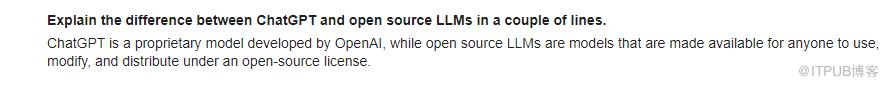 query = "Explain the difference between ChatGPT and open source LLMs in a couple of lines."result = llm(query)display(Markdown(f"{query}"))display(Markdown(f"{result}