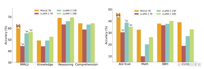 Mistral-7B是由Mistral AI开源的,在多个benchmark上超过LLaMA2,如下图所示: