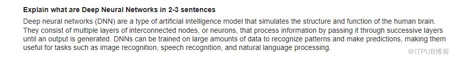 query = "Explain what are Deep Neural Networks in 2-3 sentences"result = llm(prompt.format(text=query))display(Markdown(f"{query}"))display(Markdown(f"{result}
