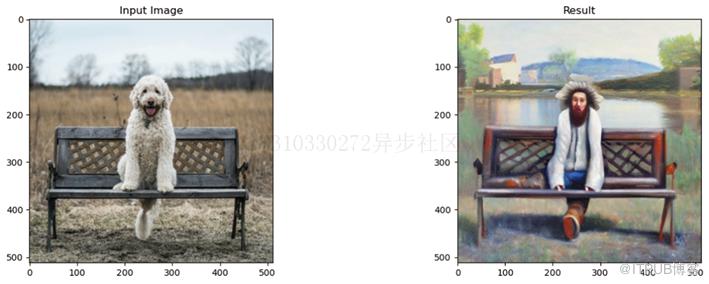 # 载入Depth2Img管线pipe = StableDiffusionDepth2ImgPipeline.from_pretrained("stabilityai/stable-diffusion-2-depth")pipe = pipe.to(device)# 使用提示文字进行图像补全prompt = "An oil painting of a man on a bench"image = pipe(prompt=prompt, image=init_image).images[0]# 查看结果,如图6-18所示fig, axs = plt.subplots(1, 2, figsize=(16, 5))axs[0].imshow(init_image);axs[0].set_title('Input Image')axs[1].imshow(image);axs[1].set_title('Result')