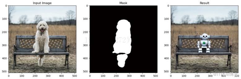 pipe = StableDiffusionInpaintPipeline.from_pretrained("runwayml/stable-diffusion-inpainting")pipe = pipe.to(device)# 添加提示文字,用于让模型知道补全图像时使用什么内容prompt = "A small robot, high resolution, sitting on a park bench"image = pipe(prompt=prompt, image=init_image,mask_image=mask_image).images[0]# 查看结果,如图6-17所示fig, axs = plt.subplots(1, 3, figsize=(16, 5))axs[0].imshow(init_image);axs[0].set_title('Input Image')axs[1].imshow(mask_image);axs[1].set_title('Mask')axs[2].imshow(image);axs[2].set_title('Result')