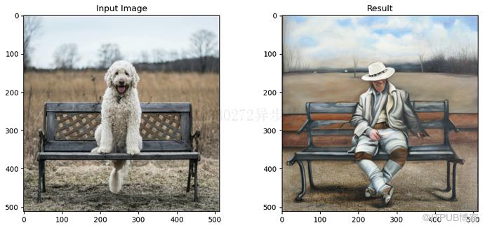 result_image = img2img_pipe(prompt="An oil painting of a man on a bench",image = init_image, # 输入待编辑图片strength = 0.6, # 文本提示在设为0时完全不起作用,设为1时作用强度最大).images[0]# 显示结果,如图6-15所示fig, axs = plt.subplots(1, 2, figsize=(12, 5))axs[0].imshow(init_image);axs[0].set_title('Input Image')axs[1].imshow(result_image);axs[1].set_title('Result')