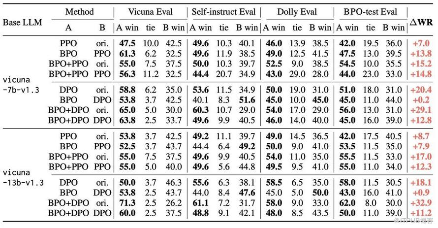 BPO可以应用在任何LLM模型上,经验结果表明,使用BPO对齐的ChatGPT的胜率比原始版本提高了22%,GPT-4的胜率提高了10%。对于相同的LLM,BPO对齐的LLM性能优于PPO和DPO对齐,而且BPO技术可以与PPO或DPO进行组合使用,可能带来额外的性能增益。