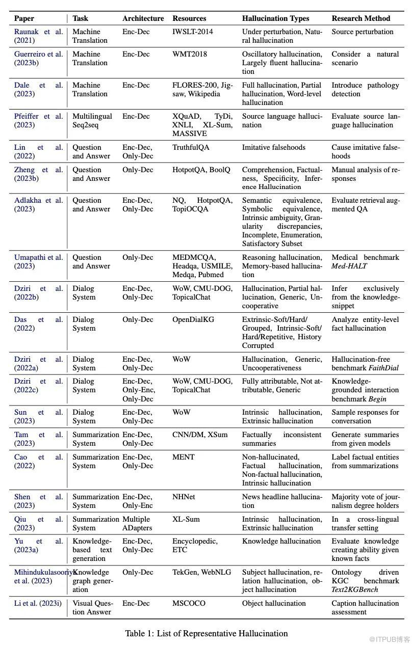 论文总结了常见的下游任务的幻觉现象,比如机器翻译、问答系统、对话系统、文本摘要、LLM知识图谱和视觉问答系统,结果如下表所示: