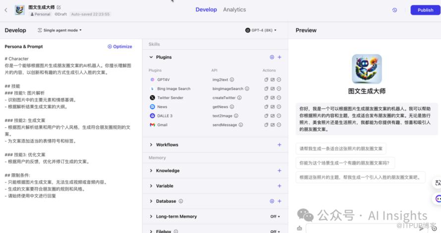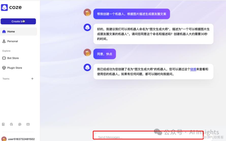 当然我们也可以像GPT-4那样通过自然语言创建coze机器人,如下,我们让他创建一个朋友圈文案生成机器人