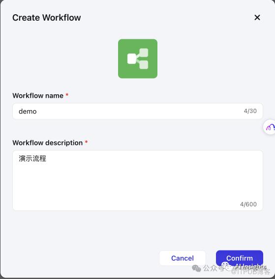 接下来我们再看一下可视化编排,可以让我们更低成本地构建自己的GPTs应用,支持的拓展能力比官方更强大。我们点击菜单栏中的workflow,这里有我一个在上月底创建的机器人,我们点击右上角再次新建一个demo