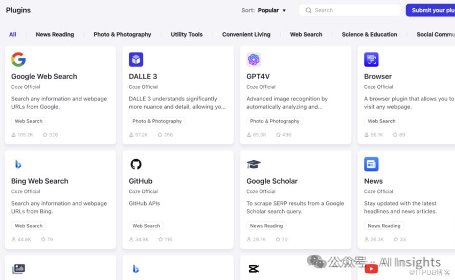 下面是Coze目前支持的插件库,非常丰富,涵盖了基本工作和学习场景的大部分工具,而且现阶段完全免费!划重点,完全免费,再次强烈推荐大家去试试