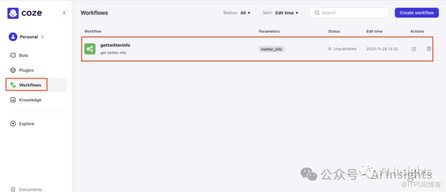 接下来我们再看一下可视化编排,可以让我们更低成本地构建自己的GPTs应用,支持的拓展能力比官方更强大。我们点击菜单栏中的workflow,这里有我一个在上月底创建的机器人,我们点击右上角再次新建一个demo
