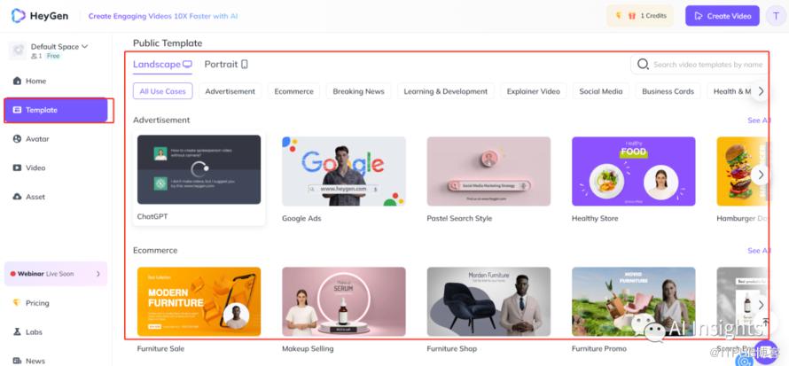 成功进入 HeyGen 操作主页后,在左侧点击 Template 选择符合需求的视频模板,这里因为我要制作自己的数字人,所以我们选择右上角的create vedio,然后根据自己照片选择对应的类型。