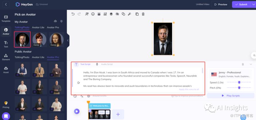 接下来我们看到马斯克的照片已经上传了,我们拷贝对应的脚本到transcript处,这时候点击预览就可以试听了,在脚本的右边我们还可以选择不同的声音。