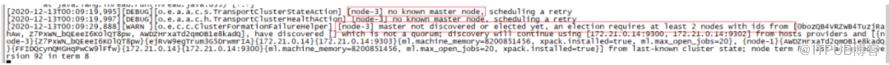 [node-3] master not discovered or elected yet, an election requires at least 2 nodes with ids from [0bozQB4VRZWB4TuzjRahAw, Z7PxWN_bQEeeI6KOlQT8pw, AWDZHrxaTd2qmOB1e8kadQ], have discovered [] which is not a quorum; discovery will continue using [172.21.0.14:9300, 172.21.0.14:9302] from hosts providers and [{node-3}{Z7PxWN_bQEeeI6KOlQT8pw}{ejRvW9egTrum3G5DrwmrIA}{172.21.0.14}{172.21.0.14:9303}{ml.machine_memory=8200851456, xpack.installed=true, ml.max_open_jobs=20}, {node-1}{AWDZHrxaTd2qmOB1e8kadQ}{FFIDQcynQMGHqPwCW9lFfw}{172.21.0.14}{172.21.0.14:9300}{ml.machine_memory=8200851456, ml.max_open_jobs=20, xpack.installed=true}] from last-known cluster state; node term 8, last-accepted version 92 in term 8