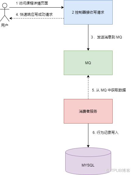 控制器接收写请求,将观看视频行为记录转换成消息 ; 教研服务发送消息到 MQ ,将写操作成功信息返回给前端 ; 消费者服务从 MQ 中获取消息 ,批量操作数据库 。