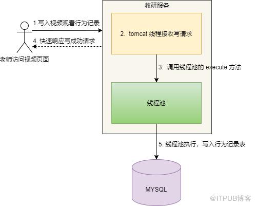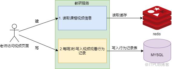 当教师观看视频的过程中,浏览器每隔3秒发起请求,教研服务将观看行为记录插入到数据库表中。而且随着用户在线人数越多,写操作的频率也会指数级增长。
