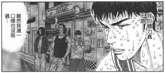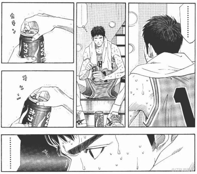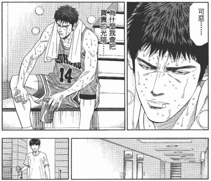 湘北陵南之战,三井体力不支,被队友抬到休息室。彼时彼刻,他连拧开易拉罐的力气都没有,“虽然我连一口烟都没有吸过。。。为什么我会把宝贵的光阴。。。可恶”。他流下了懊悔的眼泪。