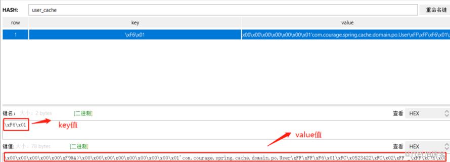 Controller层调用 getUserById方法,用户ID为1的时候,可以从Redis Desktop Manager里看到:用户信息已被缓存,user_cache缓存存储是Hash数据结构。