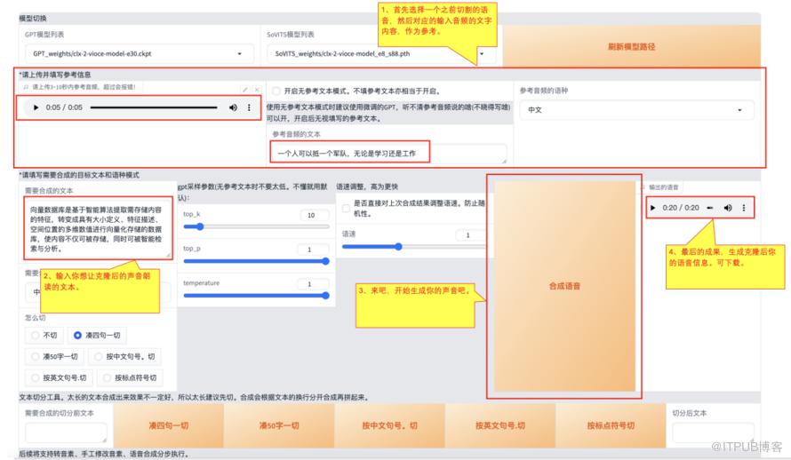 1)、选择一个之前切割的语音,然后对应的输入音频的文字内容,作为参考