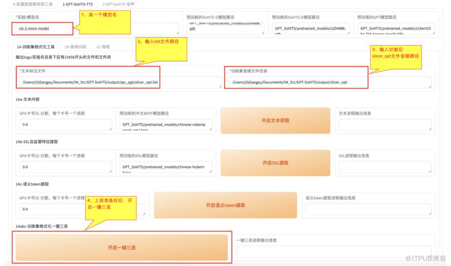 选择【1-GPT-SoVITS-TTS】选项卡后,输入下面三个信息,然后进行一键三连: