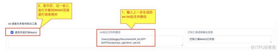 在【语音文本校对标注工具】中,输入上面生成的【slicer_opt.list】路径,然后选中【是否开启打标WebUI】,过一会儿会打开一个新的web页面,需要一条一条进行语音校对。