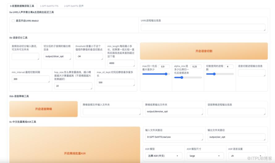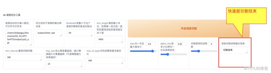 这一步很简单,只需在【语音切分工具】部分,输入上面处理完的output文件夹路径即可,其他参数默认不变。