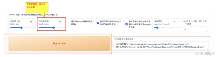 然后进行【GPT】的训练,参数都默认就可以。如果想要训练后的结果更精确,可以调高【总训练轮数total_epoch】参数,我这里设置为了【30】。