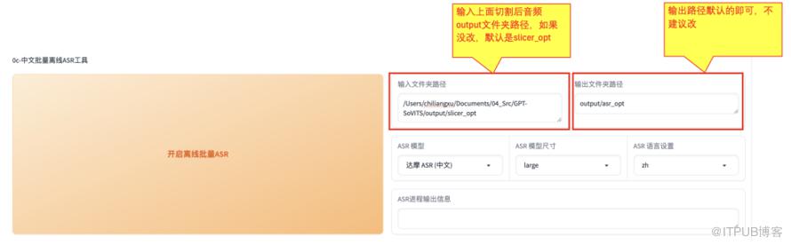 在中文批量离线ASR工具部分,输入上面切割后的音频路径,如果上面步骤没改,默认应该是【slicer_opt】中,进行asr文件生成。