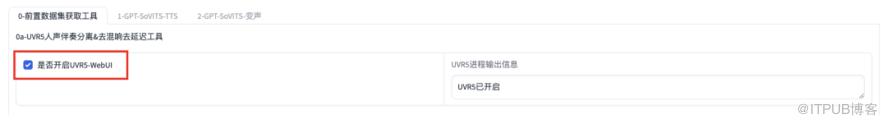 我们首先要做的是去除背景音和杂音,打开Web页面后,找到下面的【0-前置数据集获取工具】,选中下面的【是否开启UVR5-WebUI】。