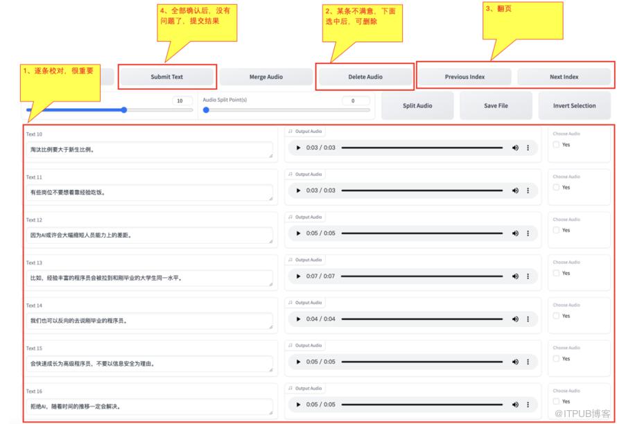 在打开新的web页面中,需要对切割后的语音,一条一条的校对,原则如下: