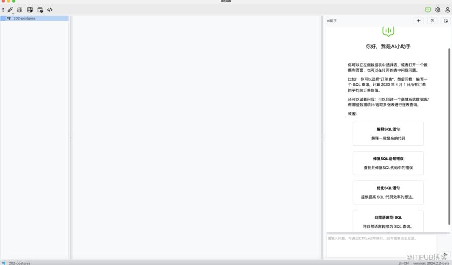 相信从上面的图大家也可以看出来,其交互,主要是提供了一个Chatbot的聊天窗口,通过聊天的方式,辅助你进行核心的四个功能:自然语言写SQL、解释SQL、优化SQL、修改SQL。所以本质上还是基于SQL文的操作。